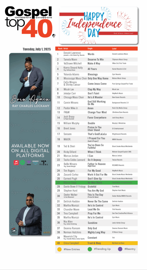 Home Music Charts Gospel Top 40 – Week of July 1, 2025 Charts Gospel Top 40 – Week of July 1, 2025 By Gospel Highway Eleven - July 4, 2025 1029 0 Share FacebookTwitterPinterestWhatsAppLinkedinEmailPrint SOURCE: GospelTop40.com RELATED ARTICLESMORE FROM AUTHOR Charts Gospel Top 40 – Week of Janurary 28, 2026 Charts Gospel Top 40 – Week of December 23, 2025 Charts GT40 Gospel Quartet Top 20 – November 19, 2025 LEAVE A REPLY Cancel reply Please enter your comment! Please enter your name here You have entered an incorrect email address! Please enter your email address here Save my name, email, and website in this browser for the next time I comment. Δ CONNECT WITH US3,212FansLike1,997FollowersFollow