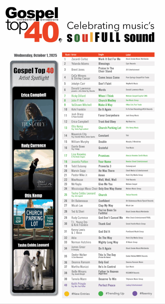 Home Music Charts Gospel Top 40 – Week of October 1, 2025 Charts Gospel Top 40 – Week of October 1, 2025 By Gospel Highway Eleven - October 3, 2025 608 0 Share FacebookTwitterPinterestWhatsAppLinkedinEmailPrint SOURCE: GospelTop40.com RELATED ARTICLESMORE FROM AUTHOR Charts Gospel Top 40 – Week of Janurary 28, 2026 Charts Gospel Top 40 – Week of December 23, 2025 Charts GT40 Gospel Quartet Top 20 – November 19, 2025 LEAVE A REPLY Cancel reply Please enter your comment! Please enter your name here You have entered an incorrect email address! Please enter your email address here Save my name, email, and website in this browser for the next time I comment. Δ CONNECT WITH US3,212FansLike1,997FollowersFollow