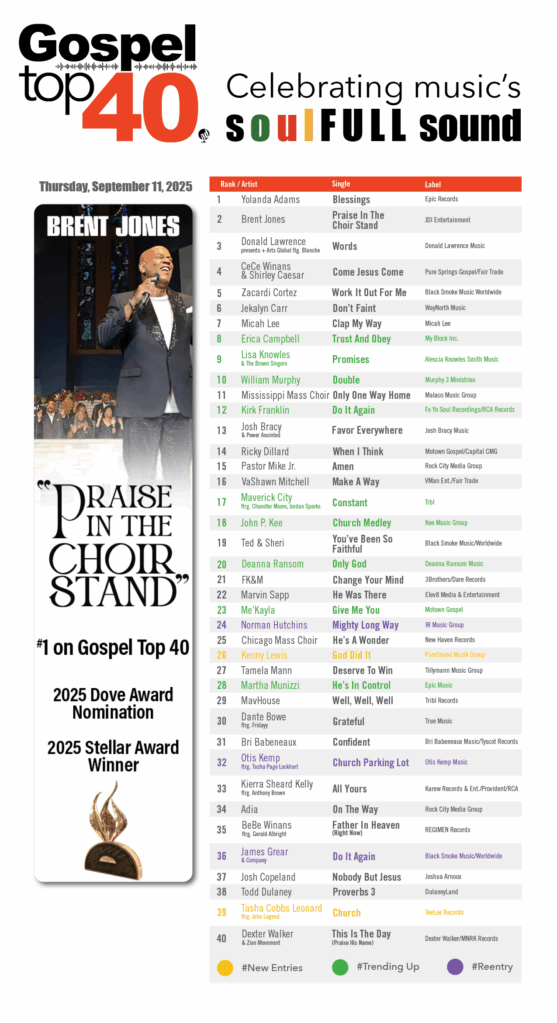 Home Music Charts Gospel Top 40 – Week of September 11, 2025 Charts Gospel Top 40 – Week of September 11, 2025 By Gospel Highway Eleven - September 19, 2025 439 0 Share FacebookTwitterPinterestWhatsAppLinkedinEmailPrint SOURCE: GospelTop40.com RELATED ARTICLESMORE FROM AUTHOR Charts Gospel Top 40 – Week of Janurary 28, 2026 Charts Gospel Top 40 – Week of December 23, 2025 Charts GT40 Gospel Quartet Top 20 – November 19, 2025 LEAVE A REPLY Cancel reply Please enter your comment! Please enter your name here You have entered an incorrect email address! Please enter your email address here Save my name, email, and website in this browser for the next time I comment. Δ CONNECT WITH US3,212FansLike1,997FollowersFollow